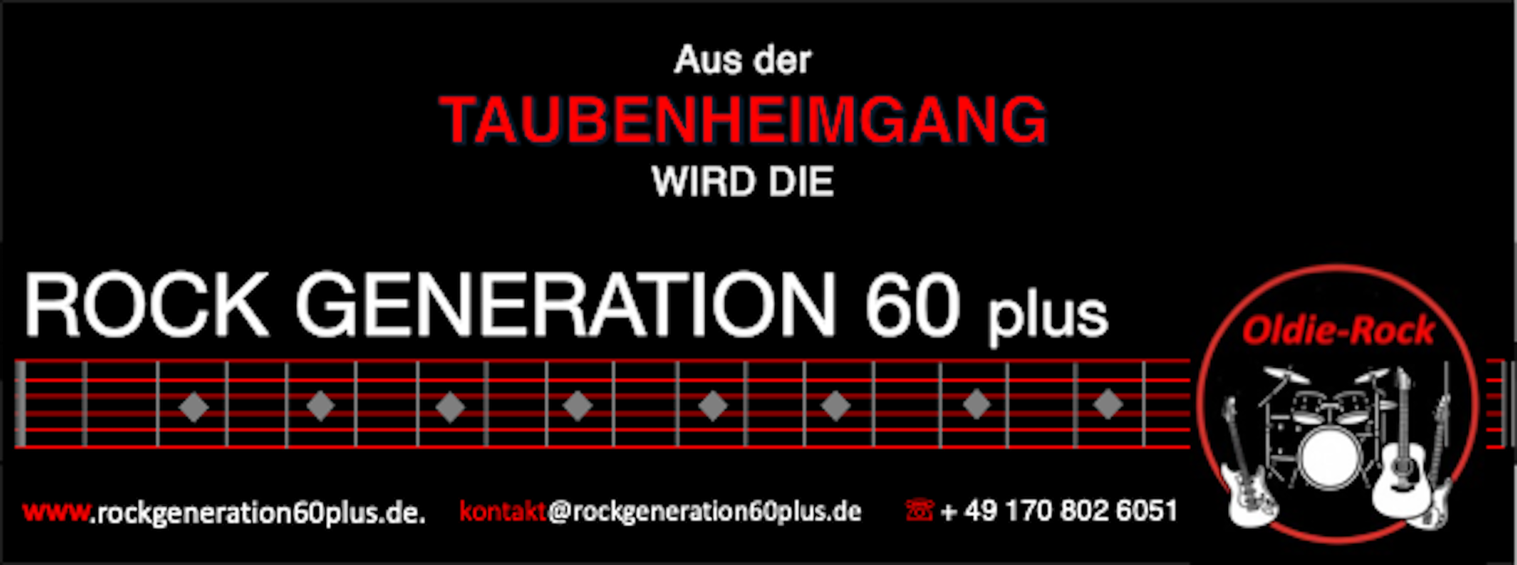 Wir haben festgestellt dass unser bisheriger Bandname etwas missverständlich war. Deshalb benennen wir uns nun um. Unser neuer Bandname ist „Rockgeneration 60 plus“. Auch unsere Homepage ist deshalb umgezogen. Um zu unserer neuen Homepage zu gelangen, klickt auf die Grafik unten oder auf diesen Link: